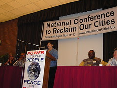 Teresa Gutierrez, International Action Center representative speaking at the National Conference to Reclaim Our Cities on Saturday, November 12, 2005. This conference was held at Wayne State University in Detroit.