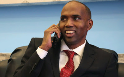 In this file photograph taken on 27 February 2017, Hassan Ali Kheyre, also spelt Khaire, speaks on a cellphone in Mogadishu. Picture: AFP